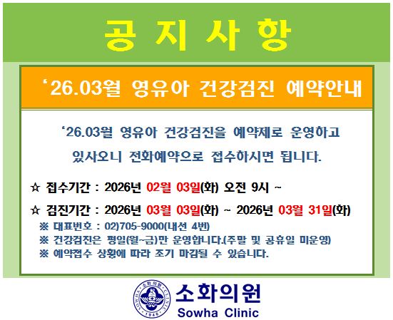 암이나 성인병등 각종 질병을 자ㆍ타각적 증상이 나타나기 전에 조기발견과 예방을 위해 소화의원은 다양한 건강검진 프로그램으로 치료 및 예방에 힘쓰고 있습니다.