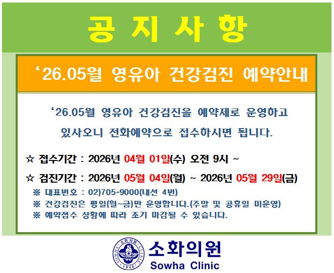 암이나 성인병등 각종 질병을 자ㆍ타각적 증상이 나타나기 전에 조기발견과 예방을 위해 소화의원은 다양한 건강검진 프로그램으로 치료 및 예방에 힘쓰고 있습니다.
