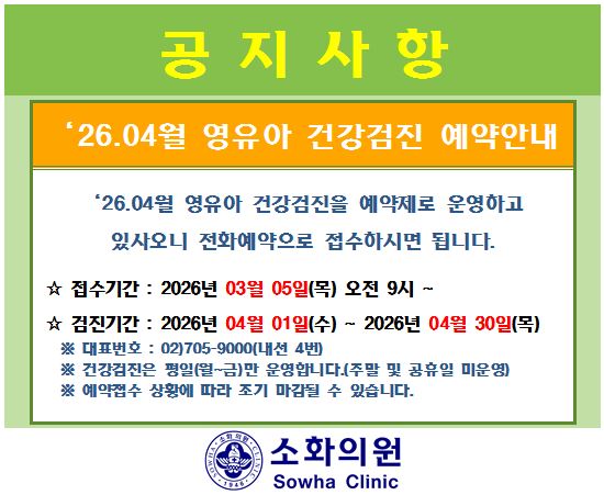 암이나 성인병등 각종 질병을 자ㆍ타각적 증상이 나타나기 전에 조기발견과 예방을 위해 소화의원은 다양한 건강검진 프로그램으로 치료 및 예방에 힘쓰고 있습니다.